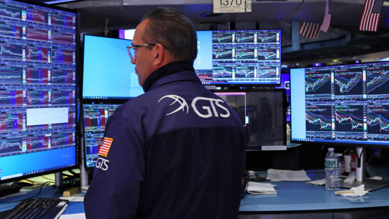 O comerciante trabalha no chão da Bolsa de Nova York durante uma negociação matinal na cidade de Nova York em 27 de maio de 2025.